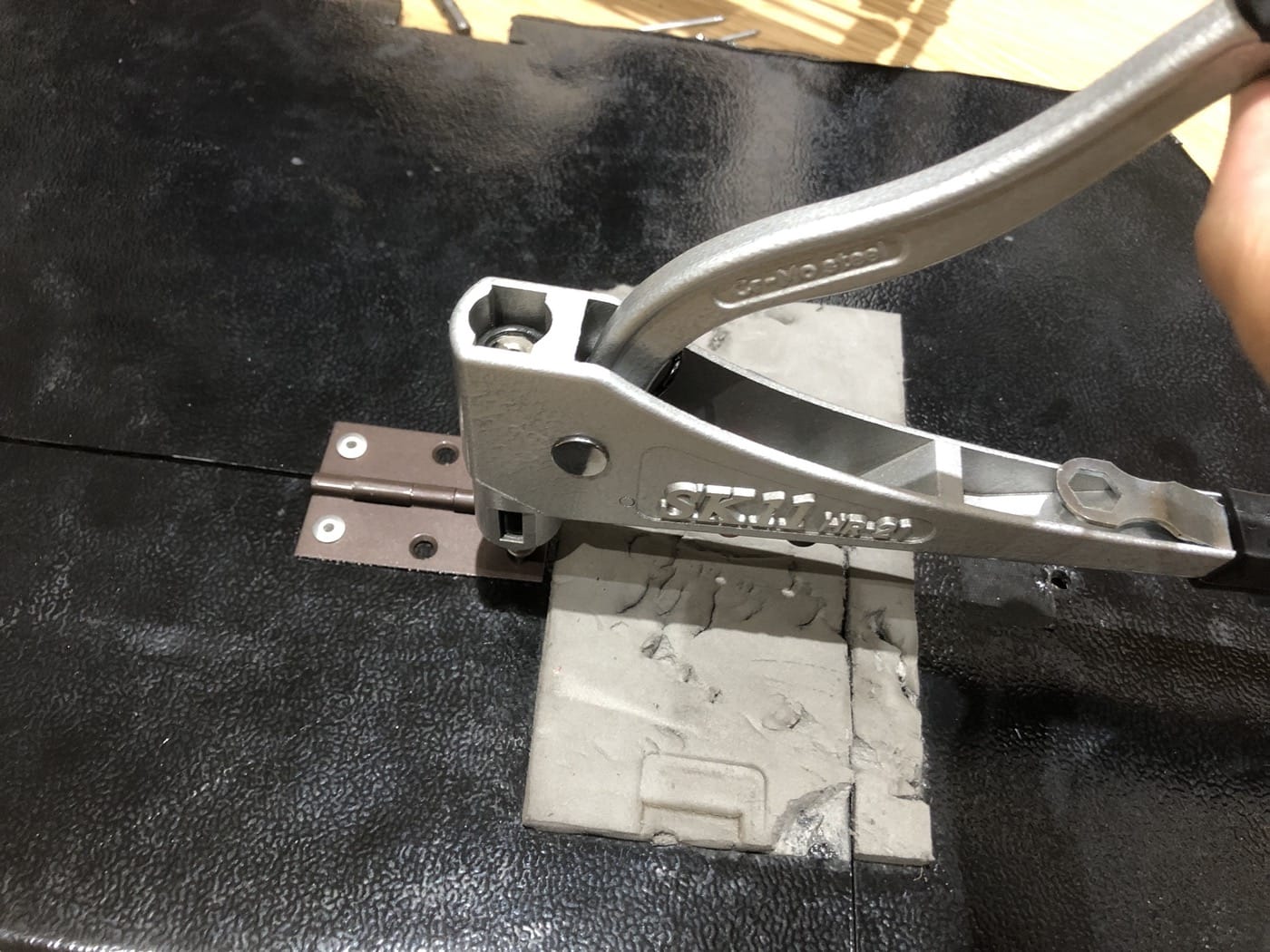 ヒンジはネジ緩みなどを気にしたくないので、ブラインドリベットとハンドリベッターを使って固定した。個人的にリベッターを使ってみたかったという理由が大きいので、ナイロンナットなどの緩み止めナットを使えば別に普通のネジで問題ないとは思う。