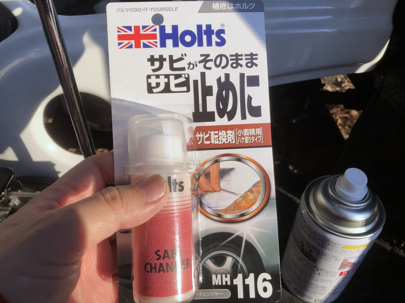 レストア系の動画で赤錆を安定した黒錆に転換するケミカルが使われているのをよく見ていたので、Holtsから出ているサビチェンジャー(サビ転換材)を選択した。