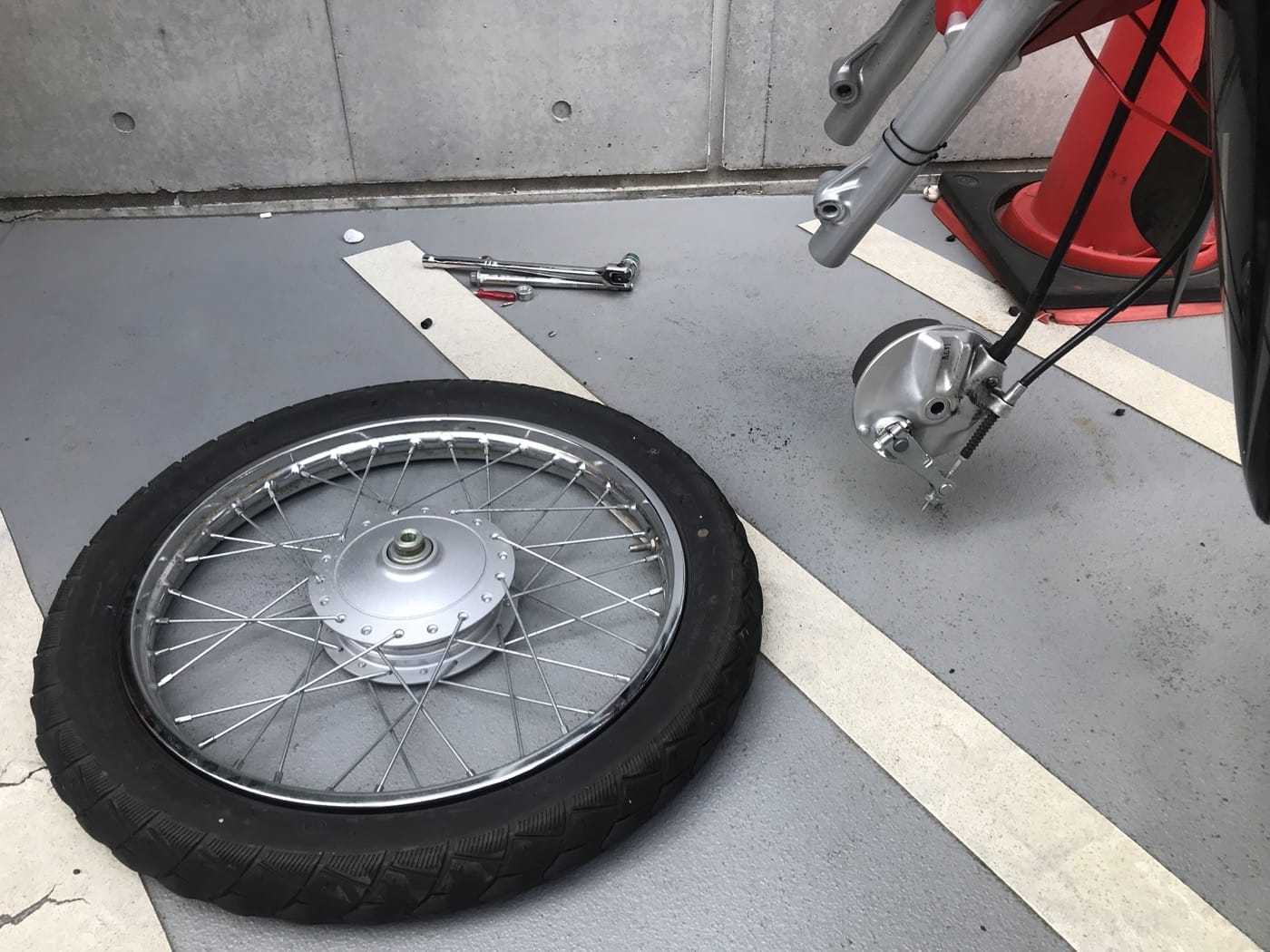 これをやる際、タイヤを手前に置いて足でタイヤの位置を調整しながらやることになると思うが、バイクを奥側に倒してしまわないように注意が必要。