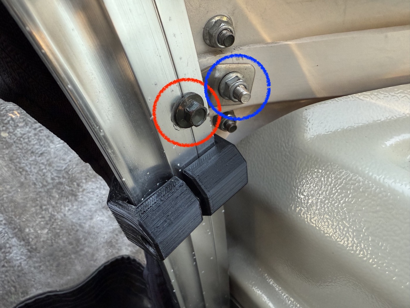 サイドミラーを取り外さないとならず面倒臭いが、サイドミラー裏にあるボルト(下掲写真青丸)を外し、金具をフリーにして先に取り付けに使うボルト(下掲写真赤丸)を締め、後からサイドミラー裏にあるボルトを締めるという手順でやることをおすすめする。