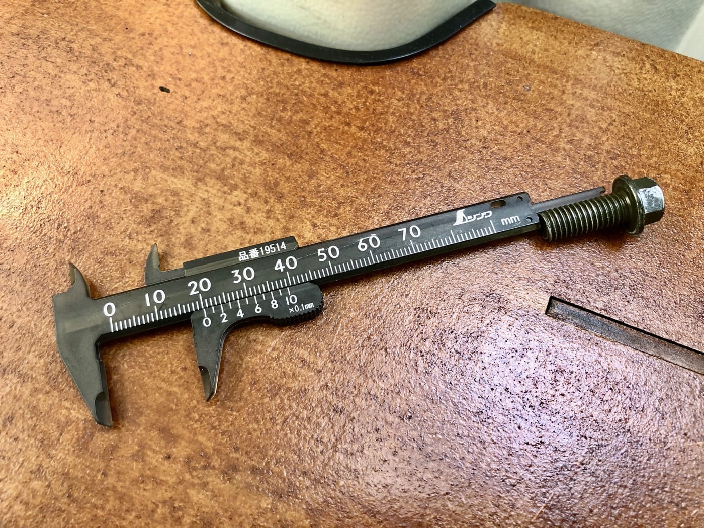 このクランプバーの取り付け部分の厚さは8mm。付け根部分がもっと薄い金属製のクランプバーを使う場合はそのままでいいが、このクランプバーの場合はM8 x 25mmのフランジボルトに交換した方がいいかもしれない。
