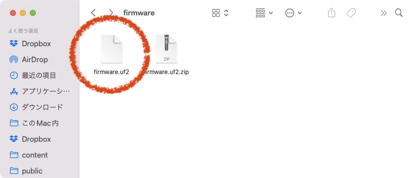 すると、PCにRaspberry Pi PicoがUSBメモリ「RPI-RP2」として見えるようになるので、そこに解凍したfirmware.uf2をドラッグ&ドロップする。