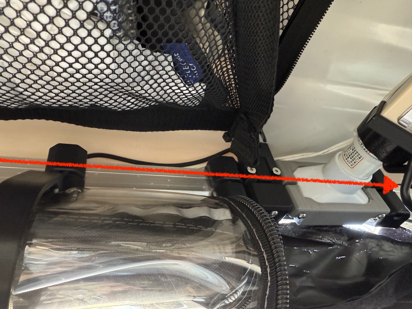 後方カメラのケーブルは右のアルミフレームの上を渡し、後部座席上のルーフとリアボディとの継ぎ目の部分にケーブルを伝わせ、リアガラスの中央に至ったところで垂直に下ろす。こんな感じの取り回しなら長さが足りた。