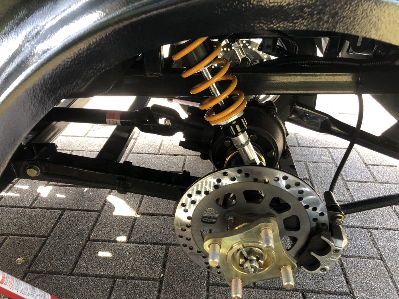 ガチガチの純正リアサスペンション。後ろに人を二人乗せるとリヤカー感が薄れ、意外にちょうどいい感じになる。