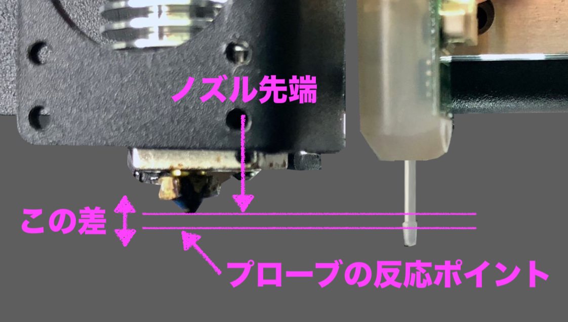 間隔調整はZ軸の下にあるバネ付きのネジでもできるし、G-codeのM851のZの数値を増減させることでもできる。