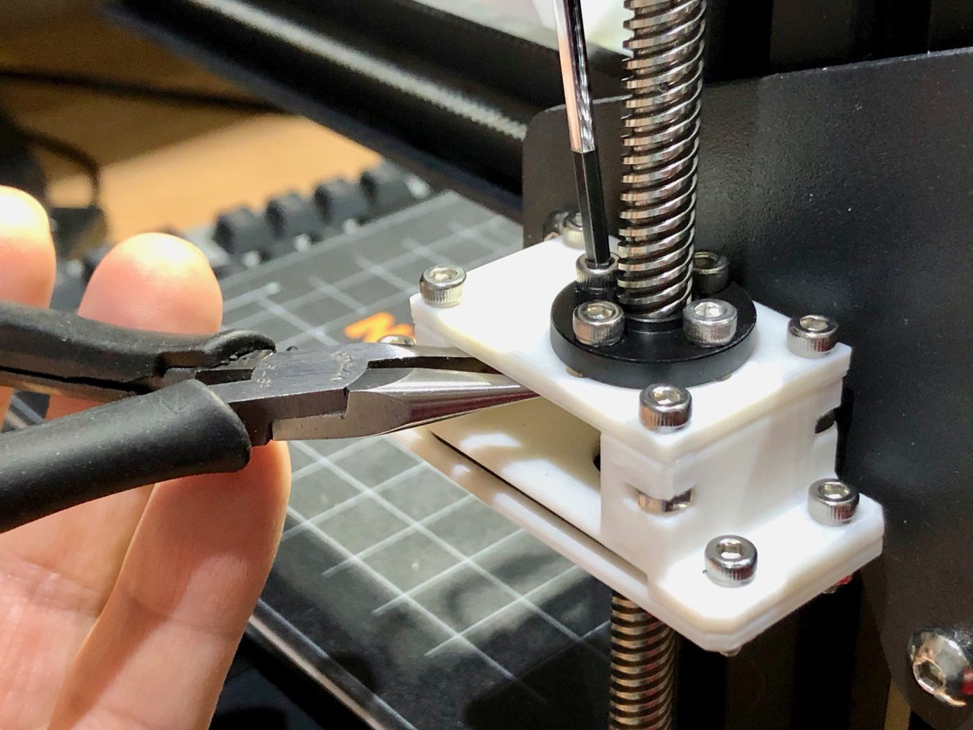 リードスクリューの垂直が出たら、リードナットを固定している4本のネジのうち、アクセス可能な前と左の2本をラジオペンチなどで位置がずれないようにしっかり締める。